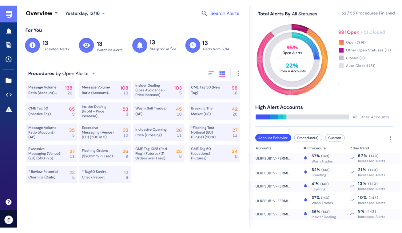 An alert is created when the system detects potential manipulation. The bottom-left quadrant groups alerts by manipulation type (“procedures”), and the upper-right quadrant shows the individual alerts within the selected procedure.