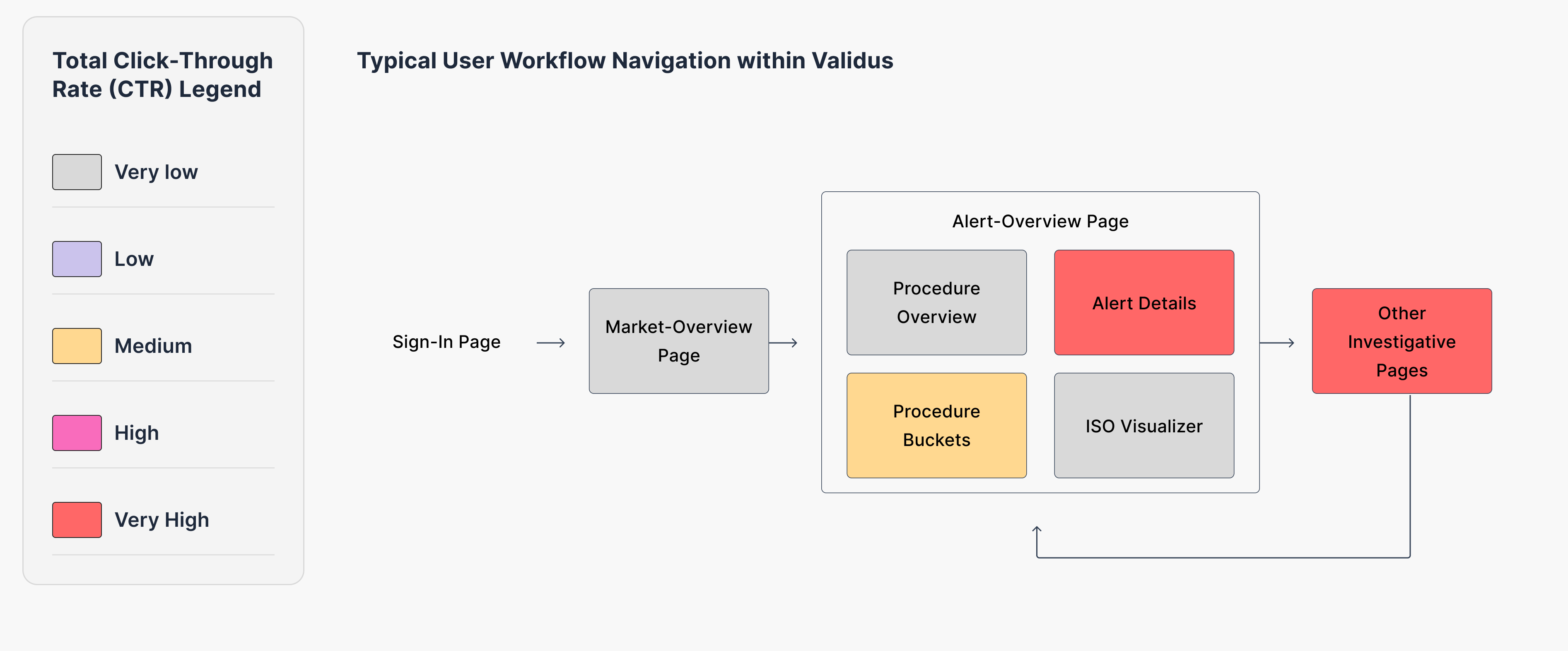 I mapped the typical Compliance Officer workflow against click-rate data to identify wasted space in the interface. Surprisingly, the Market Overview page—the first page users see—was almost always skipped, making the Alert Overview page the de facto dashboard. This CTR map now guides how I structure the navigation for the solution.